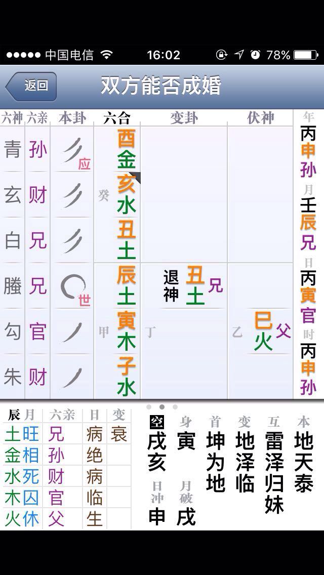 谋堂解读: 卦中世爻代表求测人,临兄弟爻,说明求测人感情不顺,所测事情存在竞争对手;兄弟爻辰土发动,所以竞争对手已有动作。 世爻动生合应爻,应爻为对方,说明求测人很喜欢对方。父母爻伏藏官下,说明男方更想要结婚。但卦中财爻两现,都发动生助官爻,男主对两人都有依赖,犹豫不决。虽然是六合卦,但因为卦主三心二意,婚姻不易成立。 六爻卜卦的准确性毋庸置疑,但很多人会觉得,"知道了结果,又改变不了,还不如顺其自然。"当然不是。预测的目的就在于帮助人们做出抉择和走出窘境。 当我们提前知道事情发展趋势和结果时,首先会做好充足的心理准备,坦然面对可能出现的最坏结果,不至于被突如其来的坏消息打击得不知所措。第二,并不是放任其发展到那个坏结果,而是通过卦象反应的不利因素结合现状,予以相应的心态、行为、风水等方法全面调整,将不好的结果转化和改善,做到"大事化小"。 上一篇八字夫妻宫详解配偶信息